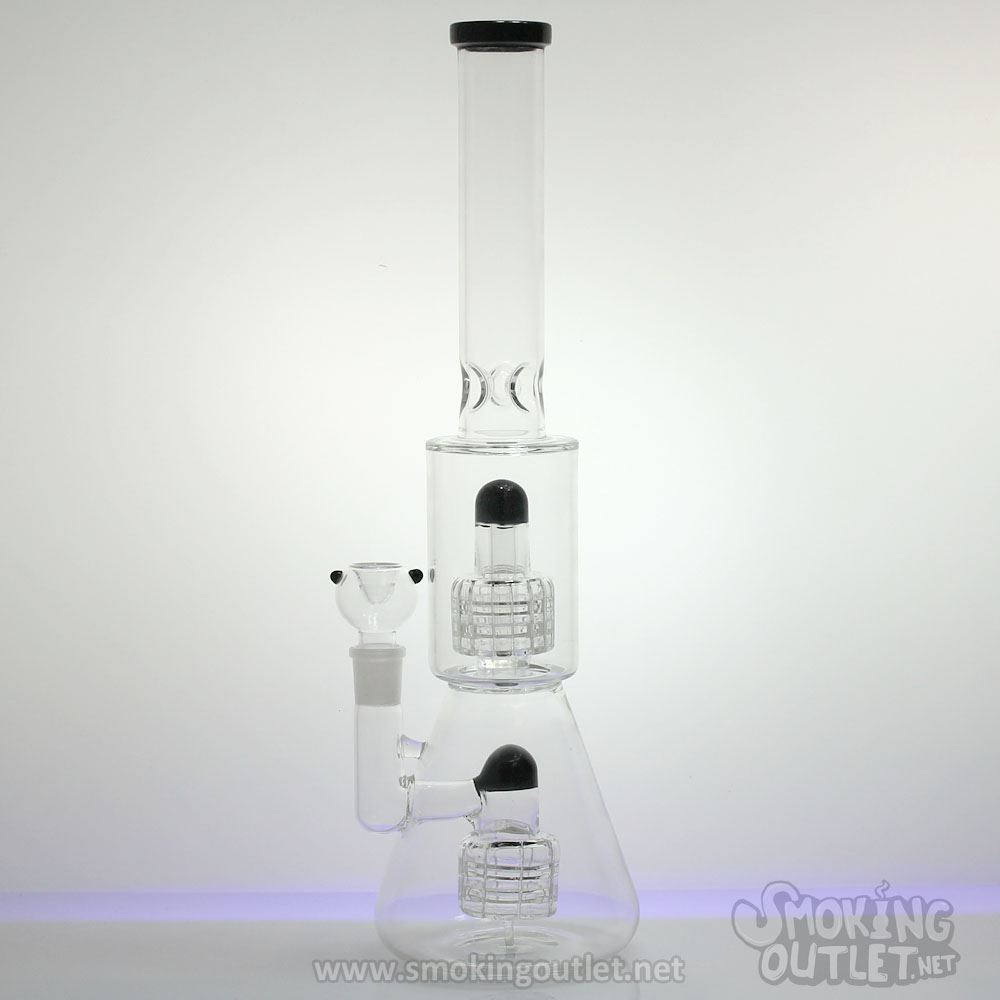 The Mega Stereo bong is nothing to sneeze at. With two heavy duty matrix percs stacked in stereo formation, this bong has the volume necessary to percolate smoke through a massive column of water, cooling and filtering for a pleasant hit.